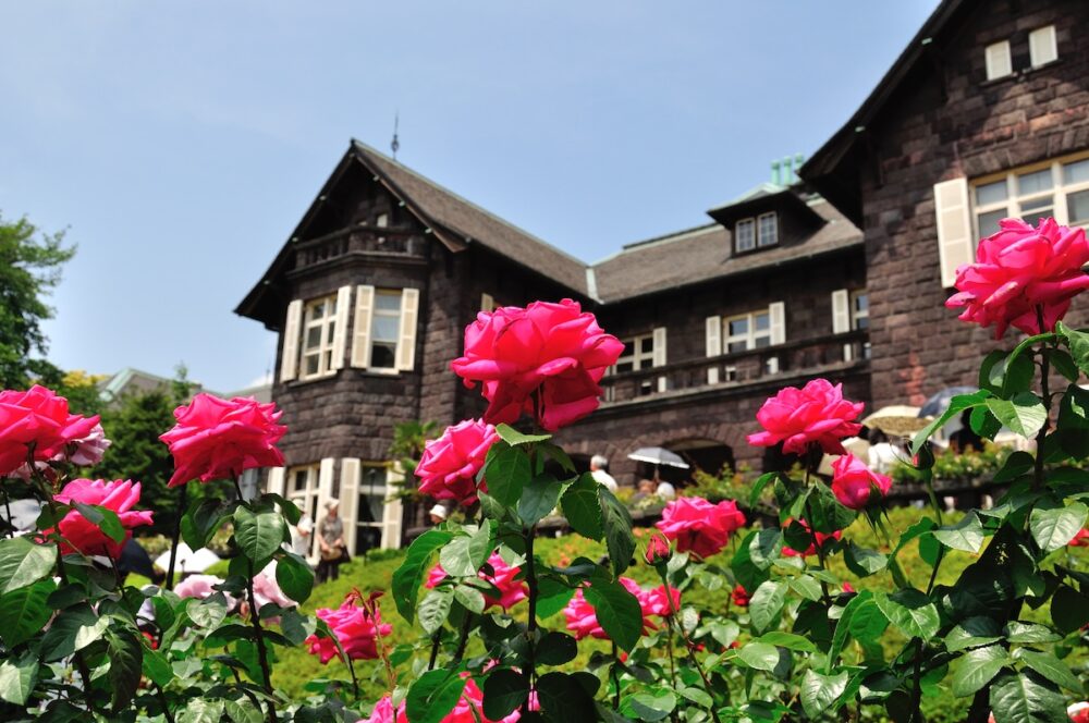 丘の上に立つ西洋風のマナーハウス。よく手入れされたバラ園と日本庭園が見もの。